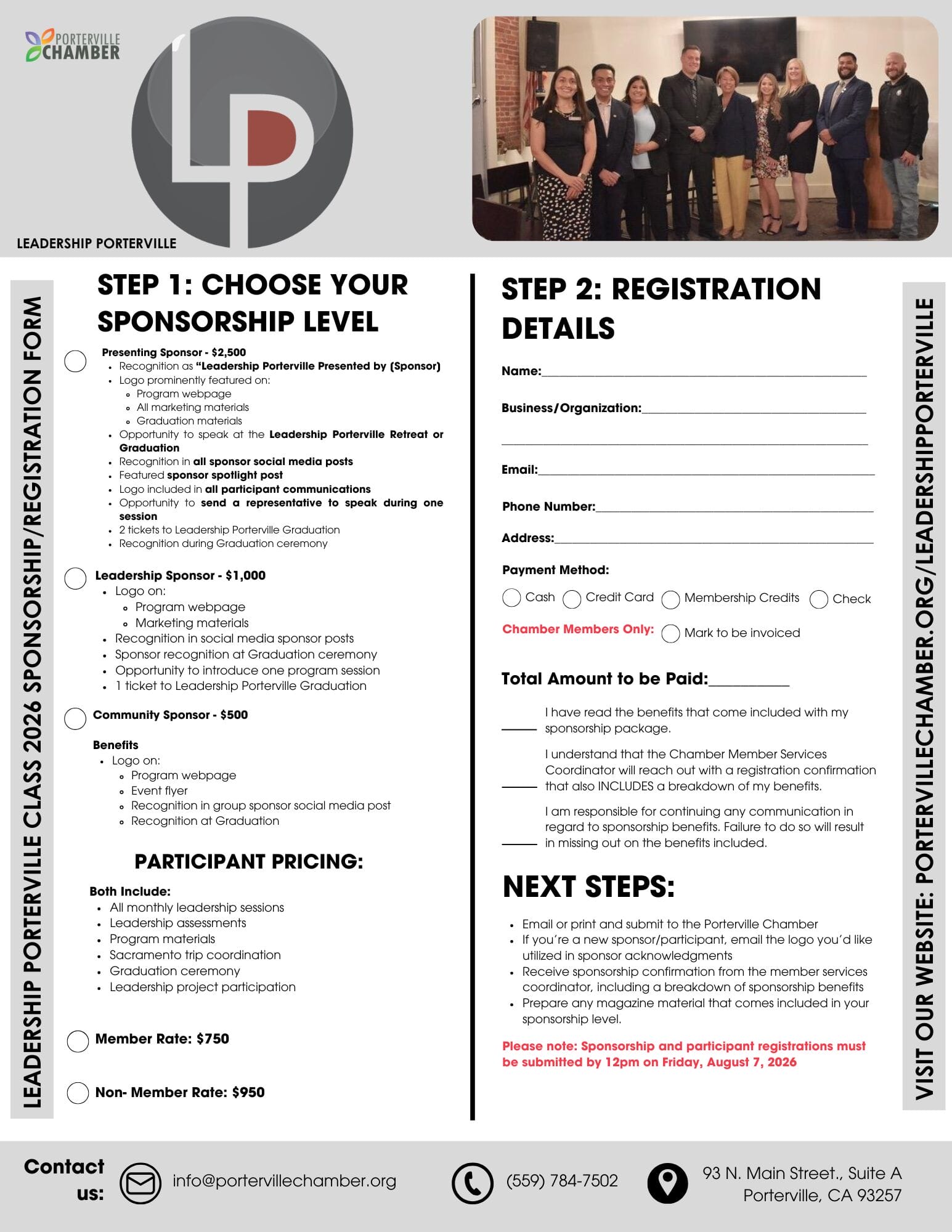 - Includes: Recognition as “Leadership Porterville Presented by [Sponsor] Logo prominently featured on: Program webpage All marketing materials Graduation materials Opportunity to speak at the Leadership Porterville Retreat or Graduation Recognition in all sponsor social media posts Featured sponsor spotlight post Logo included in all participant communications Opportunity to send a representative to speak during one session 2 tickets to Leadership Porterville Graduation Recognition during Graduation ceremony